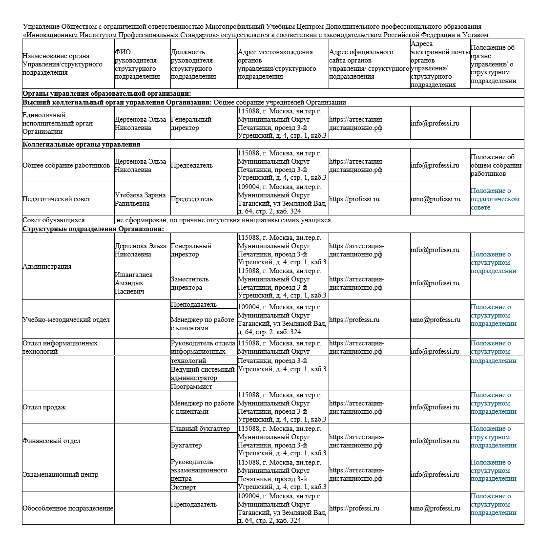Наименование органа Управления/структурного подразделения ФИО руководителя структурного подразделения Должность руководителя структурного подразделения Адрес местонахождения органов управления/структурного подразделения Адрес официального сайта органов управления/ структурного подразделения Адреса электронной почты органов управления/ структурного подразделения Положение об органе управления/ о структурном подразделении
